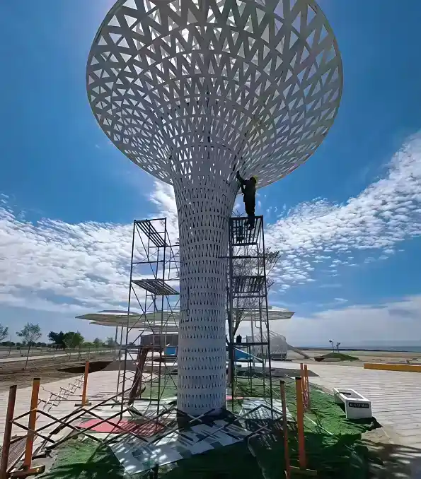 This tree-shaped sculpture is crafted from 304 stainless steel, featuring a surface adorned with mathematically designed diamond-shaped hollows that are perfectly matched in size and proportion. Finished with an epoxy protective coating, it is built to last for decades outdoors, making it especially suitable for park landscapes, real estate developments, luxury hotels, tourist resorts, and similar settings. It stands 8 meters tall with a diameter of 3 meters, and custom sizes are also available upon request.