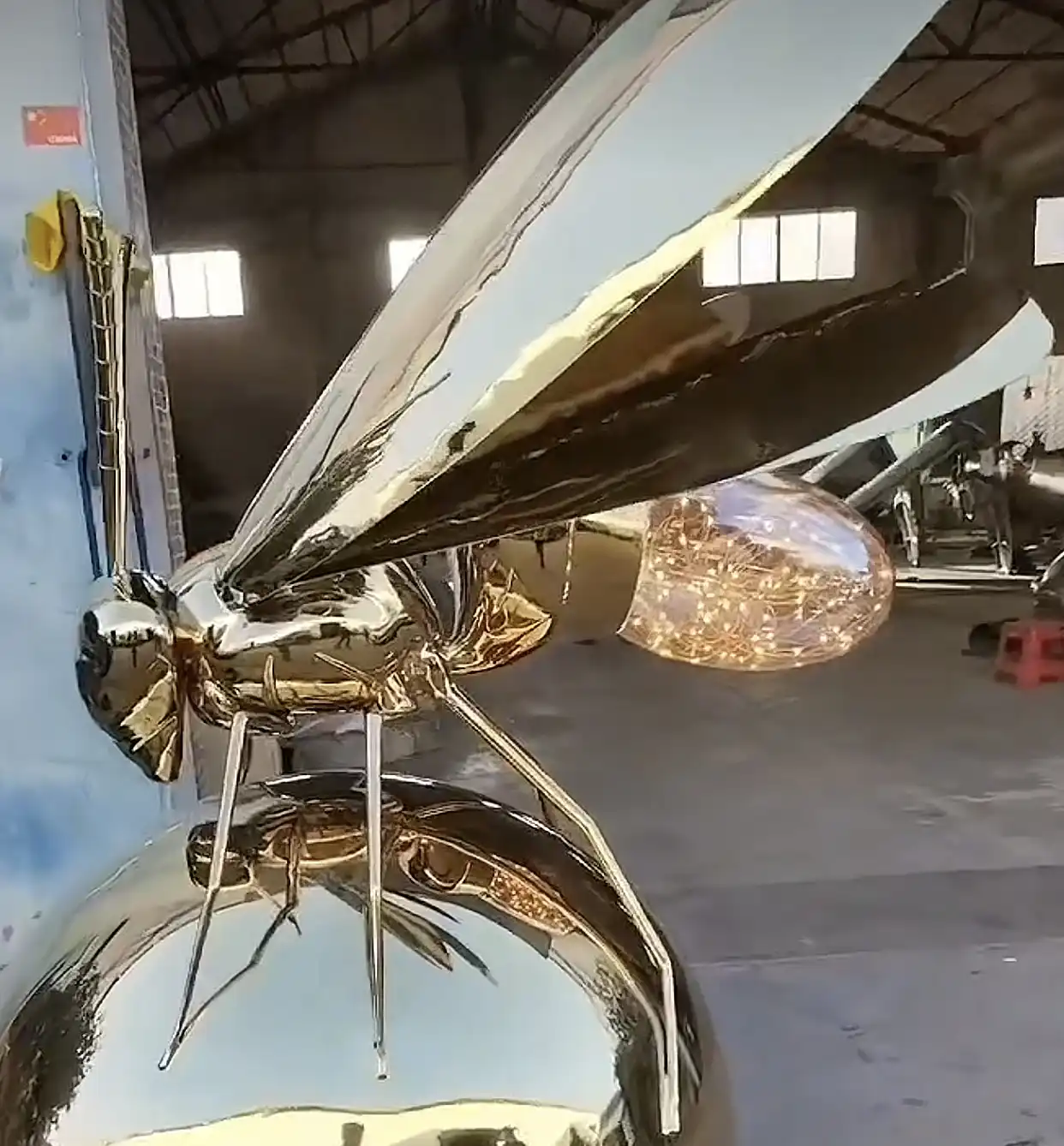 The metal material firefly sculpture made by us in China is majestically poised upon a spherical base with a diameter of 80 centimeters. Attention to detail is paramount, with every surface meticulously hand-polished to an exceptionally smooth finish, entirely free from any coarse texture or graininess. The antennae and segmented limbs of the firefly are intricately articulated, showcasing a high-quality, refined construction that mimics natural form with artistic precision. Its wings are rendered in a gracefully extended, flat posture and possess a distinctive sheen, further enhancing the visual appeal.