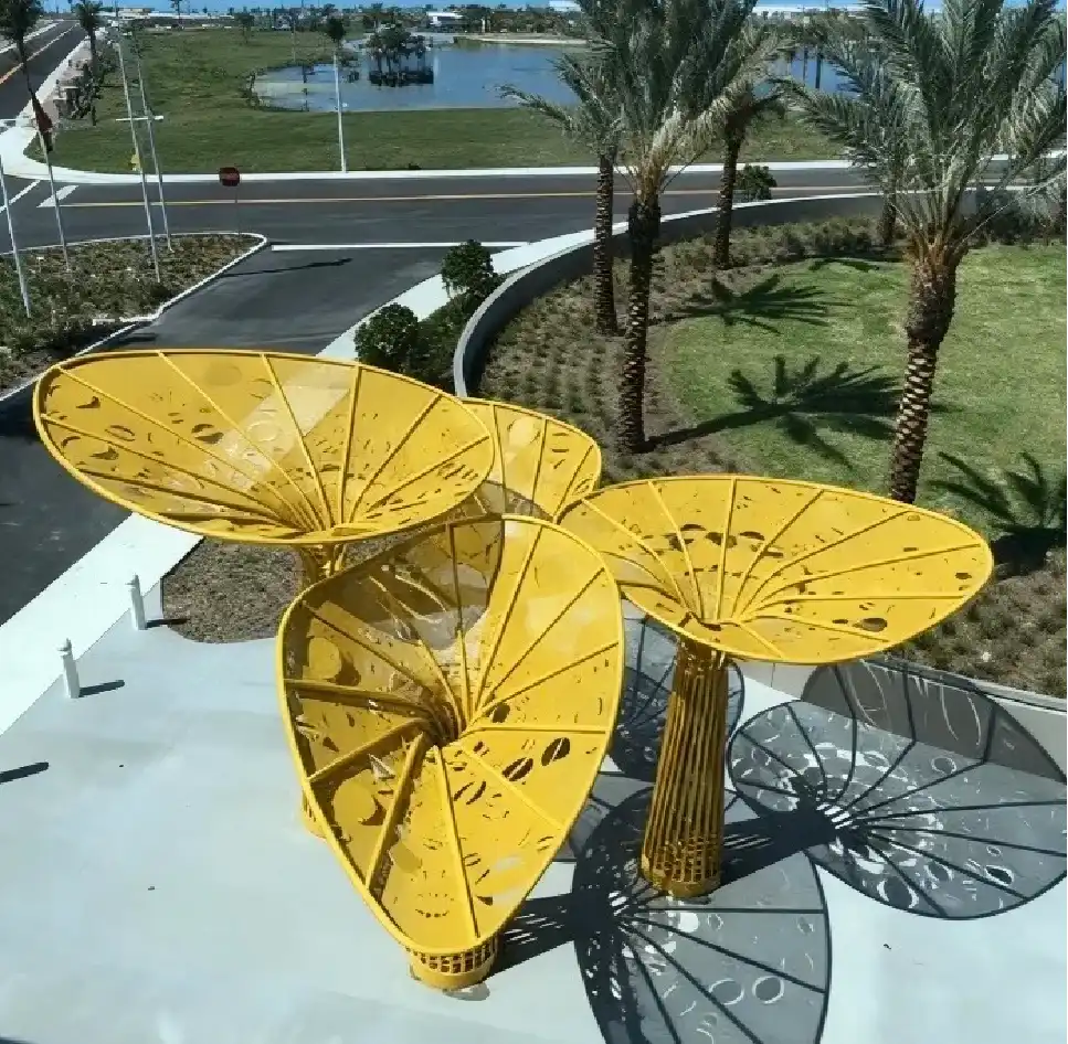 This park stainless steel pavilion presents an artistic tree-like design, featuring bright yellow trunks composed of vertical elements and an openwork umbrella-shaped canopy dotted with circular perforations of varying sizes. Integrated with color-changing LED light strips, the structure transforms at night into a vibrant, dreamlike gathering space.